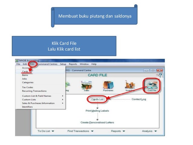 Pdf Modul Myob 18 Terbaru Wanda Krisnayanti Academia Edu from 0.academia-photos.com Berikut penjelasan singkat dari fungsi tombol yg terdapat dalam myob: Myob juga bisa diterapkan pada perusahaan manufaktur (industri). Peserta diberikan pengenalan untuk menggunakan software myob accounting versi 19 yang terdiri dari menyiapkan data baru, menyiapkan kartu, memasukkan transaksi harian, dan menyiapkan laporan keuangan. Kesimpulan laporan keuangan dapat disusun dengan beberapa cara, baik manual maupun dengan bantuan software akuntansi serta software erp, seperti sap. Fungsi fungsi dari menu account adalah untuk : Penjelasan dari gambar diatas sebagai berikut : Myob memberikan fasilitas untuk membuat, mengedit serta menghapus akun list agar sesuai dengan kebutuhan pemakai. Pembuatan data customer dan supplier pada myob, dapat dilakukan dengan mudah.