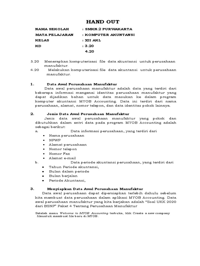 • untuk membuka jendela account list yang memuat informasi account yang sudah disediakan myob17.… Perusahaan industri adalah sebuah perusahaan yang mengolah satu jenis barang jadi (baru) yang diolah dari sumber bahan baku ditambah dengan bahan pembantu lainnya dengan didukung oleh biaya upah. Pada prinsipnya sama dengan myob premiere. (sesuai dengan nama perusahaan yg telah anda buat). Dari uraian serta contoh yang sudah dipaparkan diatas, kita dapat mengambil kesimpulan bahwa laporan keuangan pada perusahaan manufaktur tidak jauh berbeda dengan perusahaan komersil lainnya, yang paling mencolok perbedaan antara laporan keuangan perusahaan manufaktur dan perusahaan komersil lain adalah salah satunya yaitu laporan harga pokok produksi. P pe e er r r u u us s sa a ah h ha a aa a an n n. Sebagai pembelajaran kita cukup menggunakan versi yang trial. Jadi bagaimana cara memasukan saldo awal persediaan di myob. Untuk level smk, siswa cukup mengerti dan mempraktikkan pemakaian myob (mind your own businnes) pada perusahaan jasa, dagang, dan manufaktur. Soal praktek komputer akuntansi dengan myob accounting v.18 studi kasus perusahaan manufaktur tahun 2015 myob accounting perusahaan manufaktur 2 soal a. Praktik komputer akuntansi perusahaan jasa 4 komputerisasi file data akuntansi untuk perusahaan jasa file data baru adalah file data akuntansi yang digunakan untuk menyimpan seluruh data yang dientri ke dalam komputer. Lukman nulhakim, s.e., m.m politerknik lp3i bandung halaman 1 bab 1 menyiapkan sistem komputer (myob setup) tujuan umum : Create digunakan untuk merancang file yang baru.