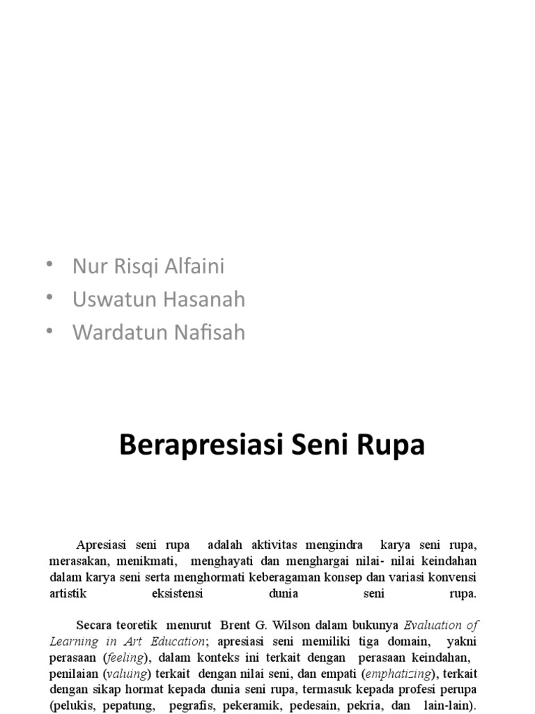 Pada rentang umur ini dalam perspektif psikologis, yaitu anak yang berumur 10 sampai dengan 22 bila anak/remaja kurang mendapatkan pengalaman dalam pengambilan keputusan, maka yaitu remaja mengembangkan kesadaran akan identitas personal yang menjadi dasar bagi pemahaman. Reaksi panca indra kita mengamati seni b. Secara umum apresiasi seni bisa diartikan sebagai kesadaran menilai atau mengulas melalui cara menghayati suatu karya seni. Kesan pencerapan 4 interpretasi : Secara psikologis pengalaman pengindraan karya seni itu berurutan dari sensasi (reaksi panca indra kita mengamati seni), emosi (rasa keindahan), impresi (kesan pencerapan), interpretasi (penafsiran makna seni), apresiasi (menerima dan menghargai makna seni, dan evaluasi.