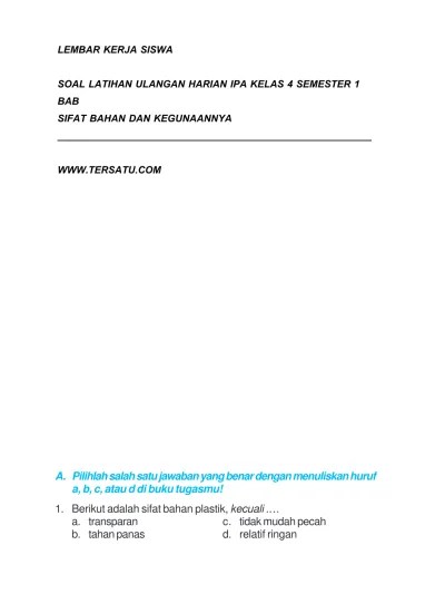 Latihan soal tentang sifat bahan dengan bahan penyusunnya (ipa kelas 5). Proses air yang didiamkan di mesin pendingin hingga menjadi keras . Setiap benda memiliki bahan penyusun yang. Soal pilihan ganda materi sifat benda dan jawaban. 20+ contoh soal sifat benda beserta indikator soal dan pembahasan penyusunannya · bahan yang digunakan untuk membuat pakaian selam harus bersifat . Benang yang terbuat dari serat kepompong ulat sutera, jika ditenun . Berikut adalah penjelasan hubungan antara sifat bahan dengan bahan penyusunnya serta mengenal perubahan sifat benda. Bahan penyusunnya tidak rapat dan tidak bergerak. Setiap benda memiliki bahan penyusun yang …. Semua benda yang ada di alam ini meliputi tiga wujud yaitu. Jadi, kesesuaian antara benda dengan bahan sangat penting agar benda dapat berfungsi dengan baik. Dan untuk kali ini kami fokuskan pada materi sifat benda dan perubahannya serta sifat bahan penyusunnya. Hubungan antara sifat bahan dengan bahan penyusunnya, perubahan sifat benda sebuah benda dapat mengalami perubahan sifat.